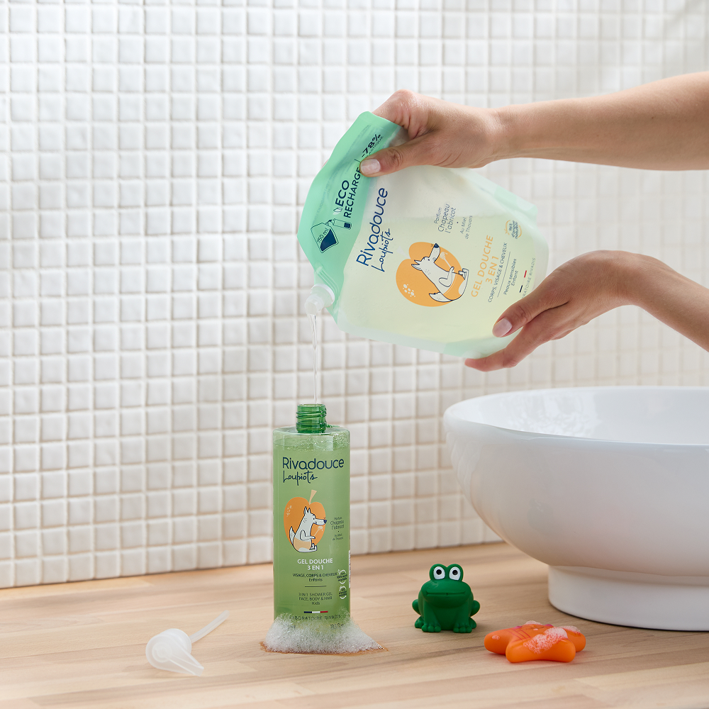 L'Eco-recharge Loupiots Chapeau l’abricot : le geste éco-responsable & économique ! Le Gel douche 3 en 1 Chapeau l’abricot nettoie, hydrate et protège le visage, le corps et les cheveux des petis loups !